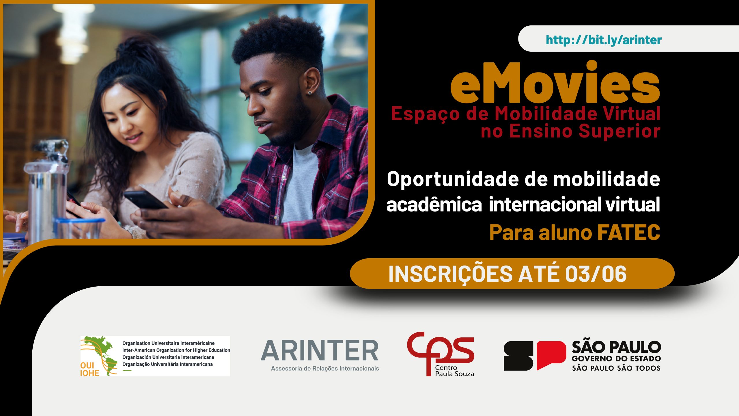 A Assessoria de Relações Internacionais do Centro Paula Souza (ARInter/CEETEPS) está com inscrições abertas para o Programa eMOVIES (Espaço de Mobilidade Virtual no Ensino Superior), iniciativa internacional coordenada pela Organização Universitária Interamericana (OUI) que promove mobilidade acadêmica virtual entre instituições de ensino superior de diversos países.